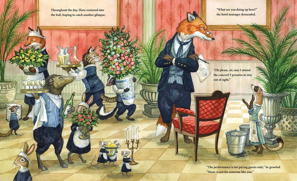 What will become of the music in Flora's heart? Flora the ferret longs to attend a concert someday, but she is only a lowly scullery maid. She must save every penny. When she discovers that the Jazzers, her favorite band, are performing at the hotel where she works, Flora is determined to hear them. But her manager forbids her from going. “Music is not for someone like you,” he tells her.